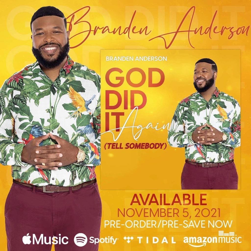 Branden Anderson’s Debut Single “God Did It Again (Tell Somebody)” Now Available for Pre-Order/Pre-Save. Official Release Date November 5, 2021
